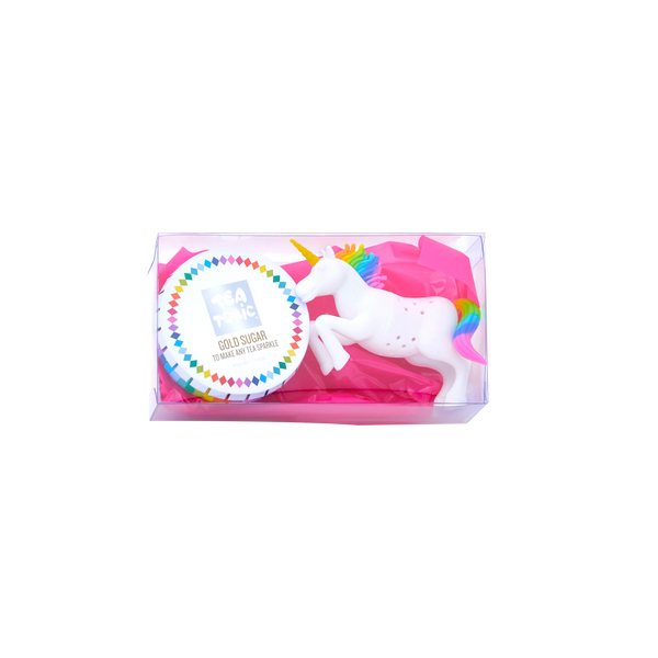 Add a little magic to your tea with this combination pack of a unicorn tea infuser and a tin of gold sugar.